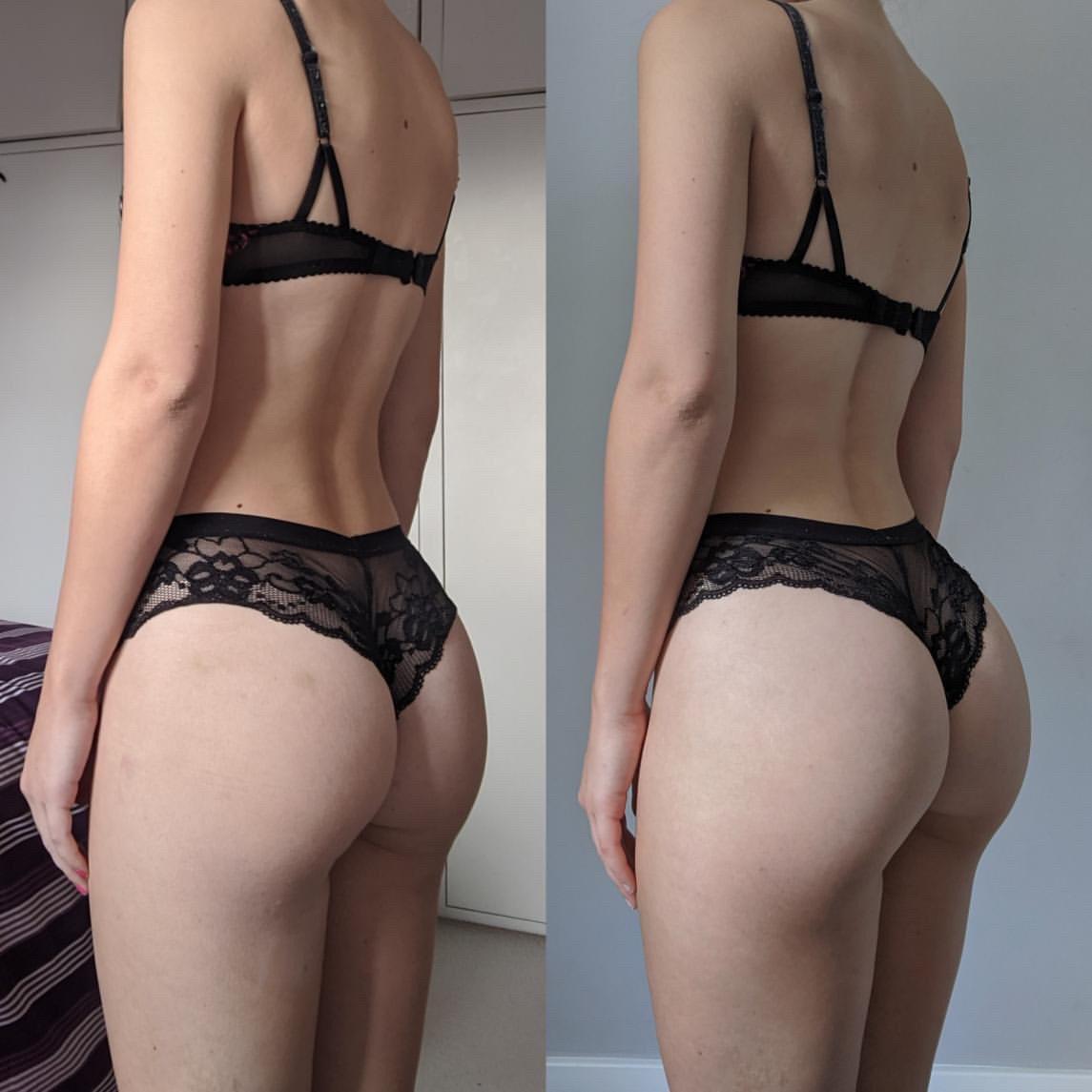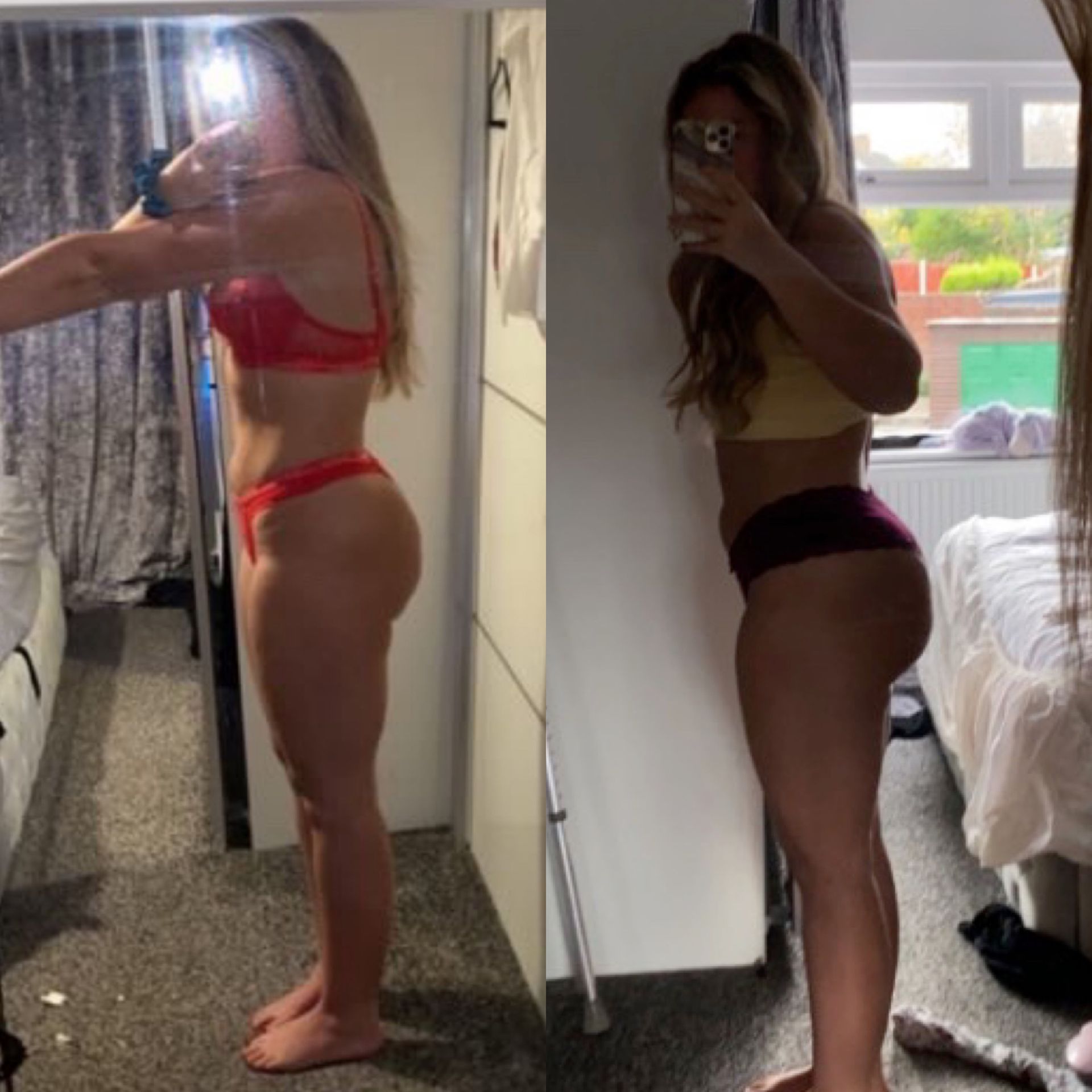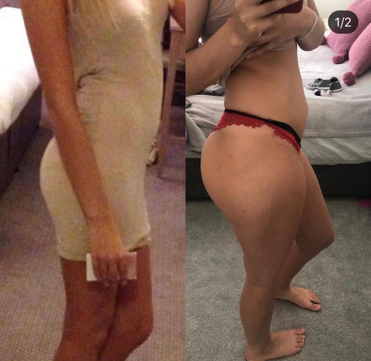 "So in a month I’ve gone from 17 to 18cm round my quads and glutes have gone from I think 33-34.5 in a month!!!! I can’t get over my body change in such a small space of time, Ben keeps saying it feels like a foreign body ๐ I’m chuffed with pictures I took from before to now it’s mental babe!"